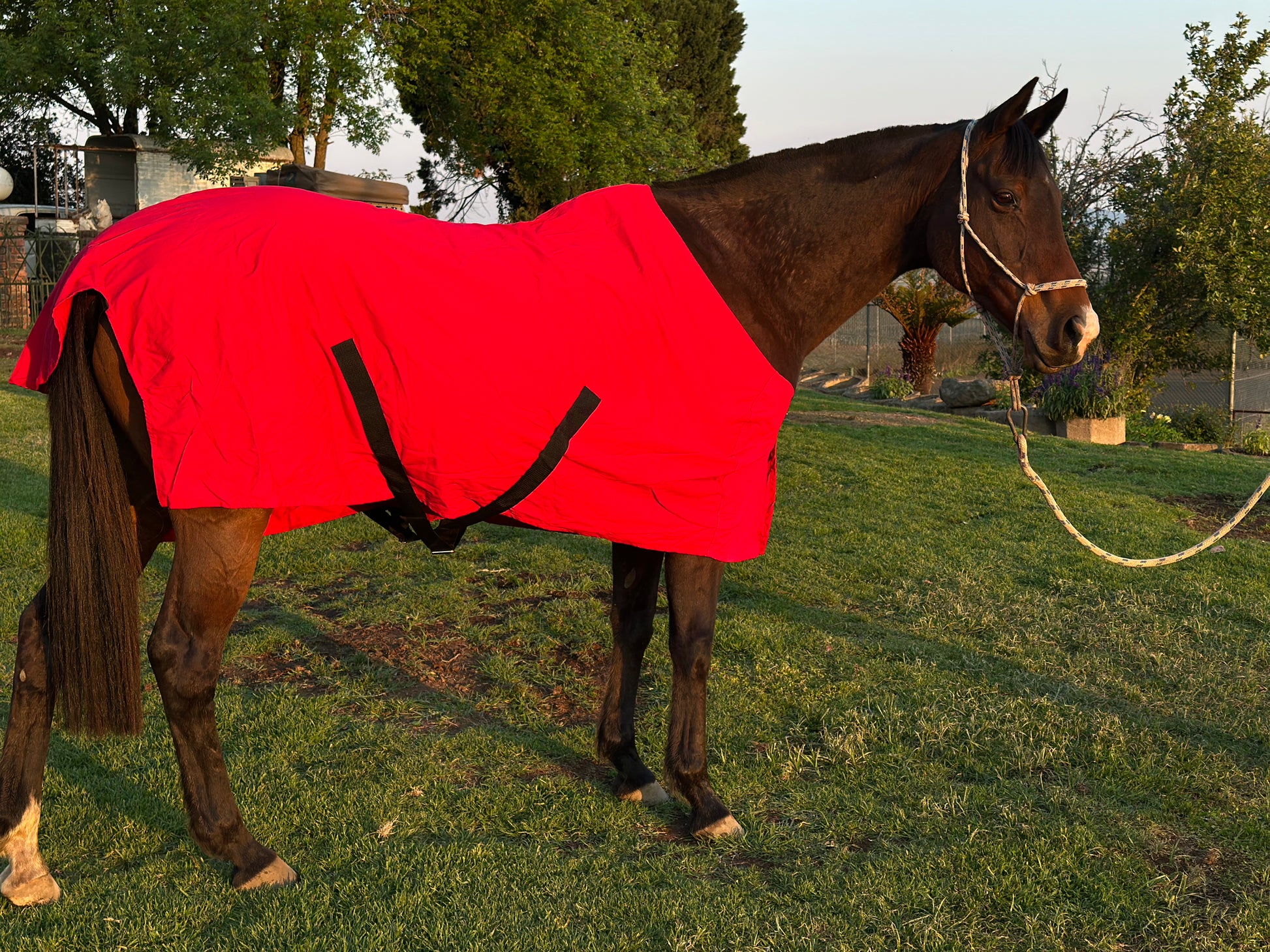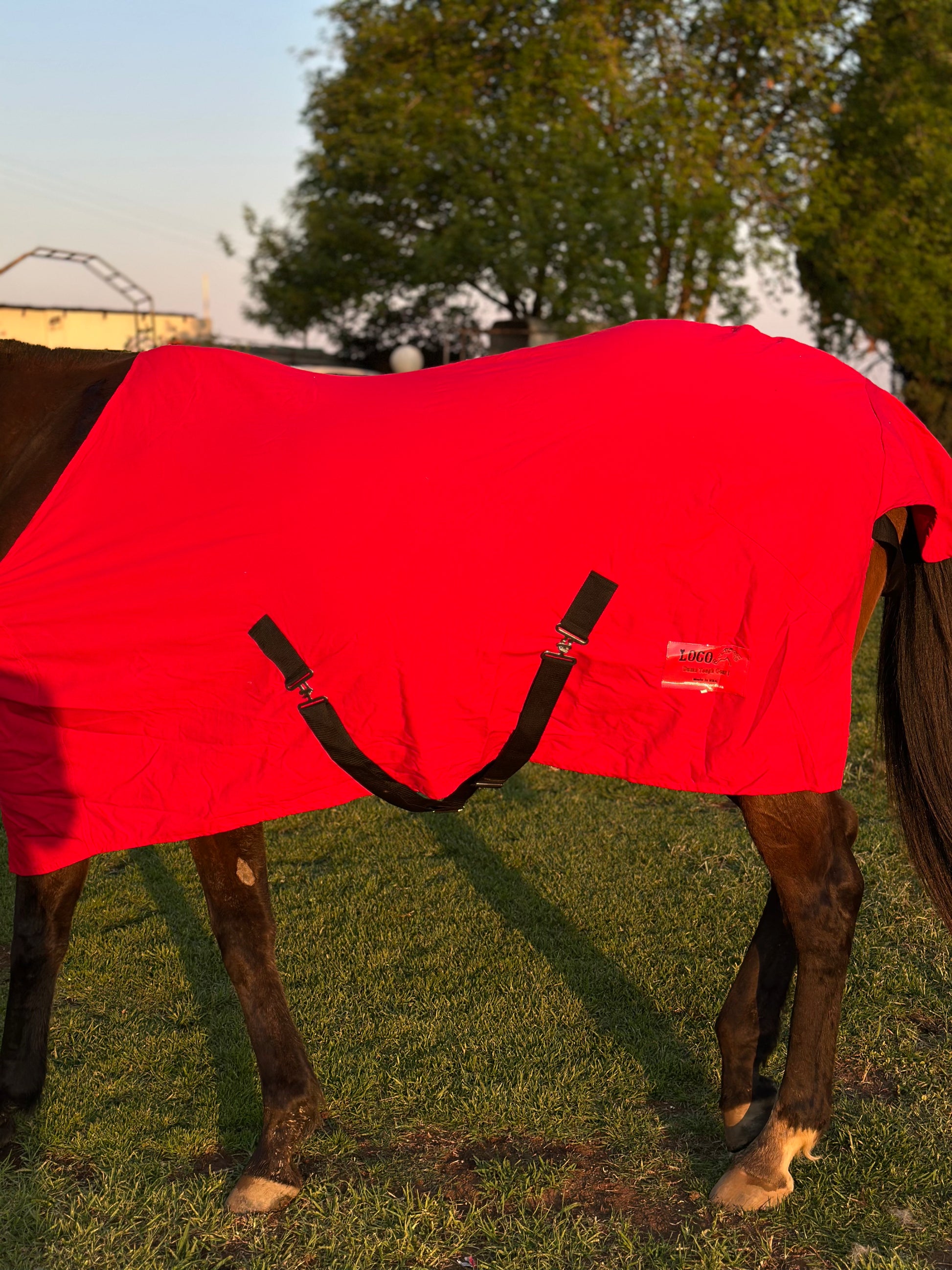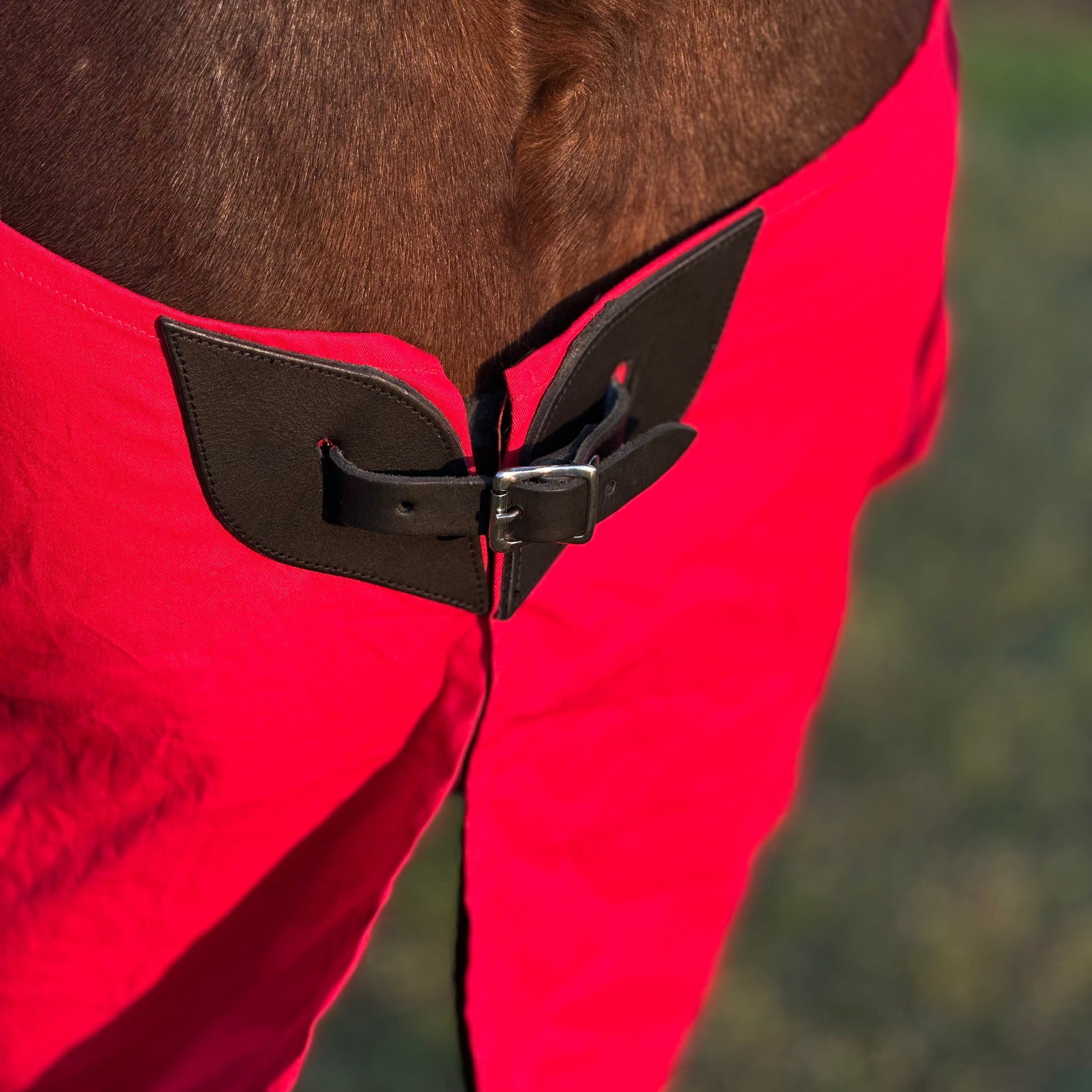Made to order. This day sheet is made from very hardy material in the colour white to reflect the sun and keep the horse cool after hard exercise. It prevents the wind from making the horse cold and is water resistant. The fabric is medium weight and has a protective collar and trimming, reducing the risk of chafe. Belly, leg straps and an under-tail strap used for safety purposes when the horse is out or in the horse box. Heavy duty leather straps are used to fasten the chest panels closed. We provide an extra one in the unlikely event of a breakage.